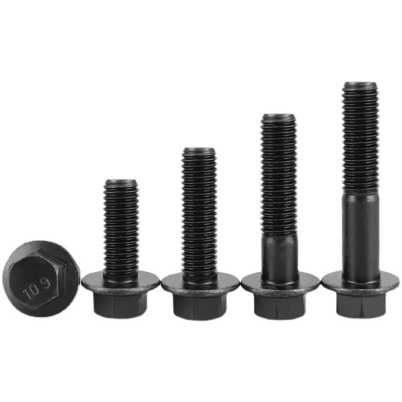 Чорні болти з шестигранною головкою та фланцем (DIN 6921, не повністю нарізані) – це кріпильні елементи з шестигранною головкою та вбудованим фланцем. Вбудований фланець служить для рівномірного розподілу навантаження, значно знижуючи ризик розкручування, особливо в умовах високої вібрації або напруження. Виготовлені з вуглецевої сталі (класи міцності, такі як 8.8, 10.9, 12.9) або легованої сталі, ці болти мають чорну поверхневу обробку, яка може бути чорним оксидом для зносостійкості або чорним цинком для покращеного захисту від корозії.